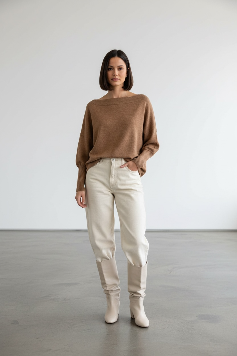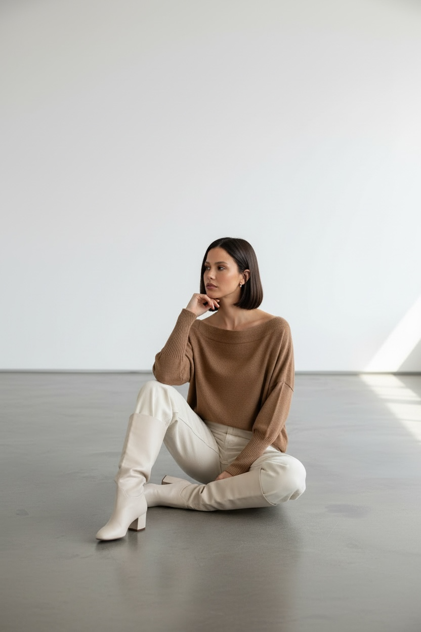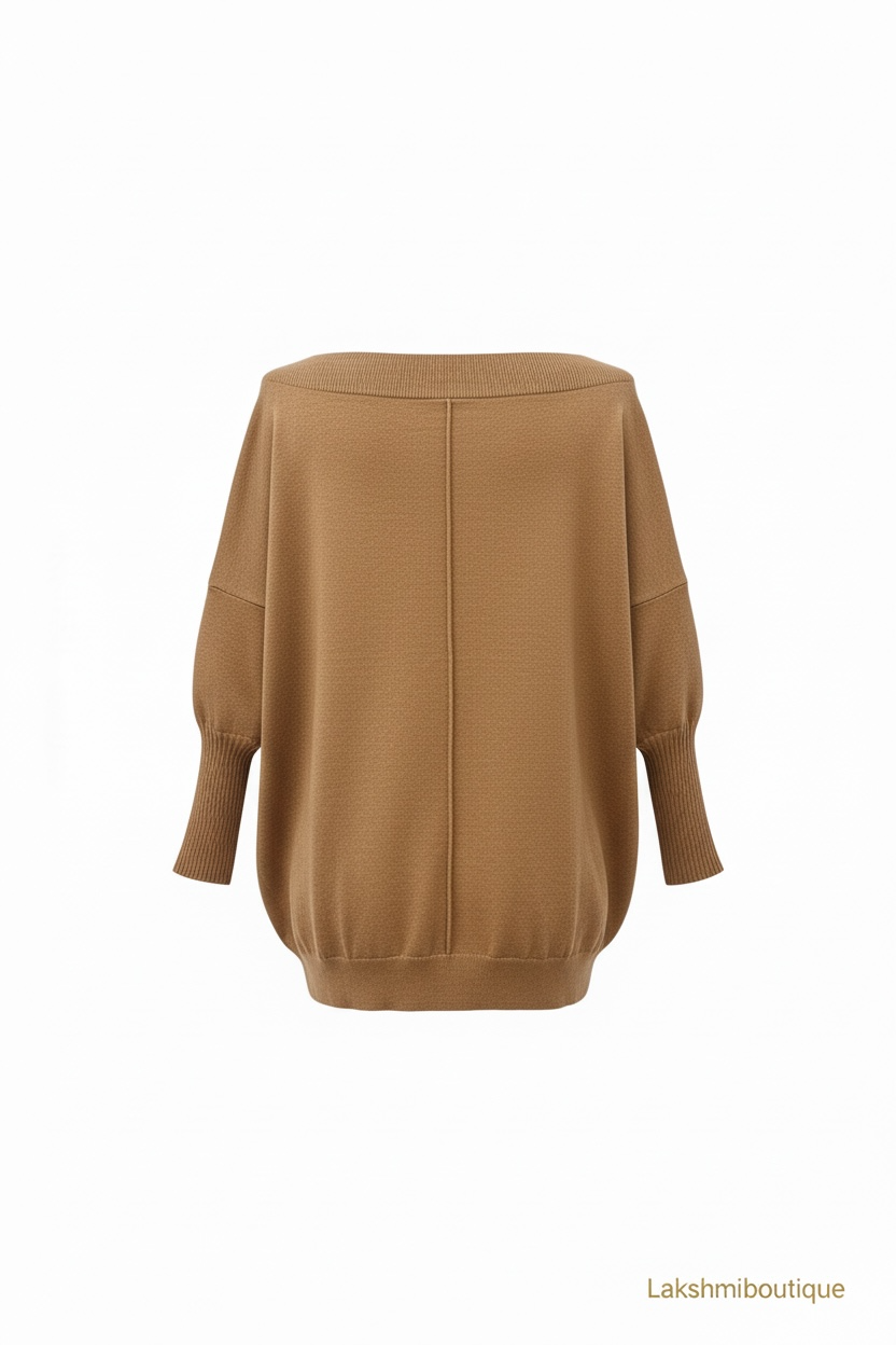 Feminen zarafeti rahat bir siluetle buluşturan Caramel Cloud Off-Shoulder Triko, omuzdan düşen geniş yakasıyla sofistike ama çekici bir duruş sunar. Oversize kesimi ve dolman kolları vücudu özgür bırakırken, rib detaylı yaka ve etek ucu kaliteli işçiliği ilk dokunuşta hissettirir.