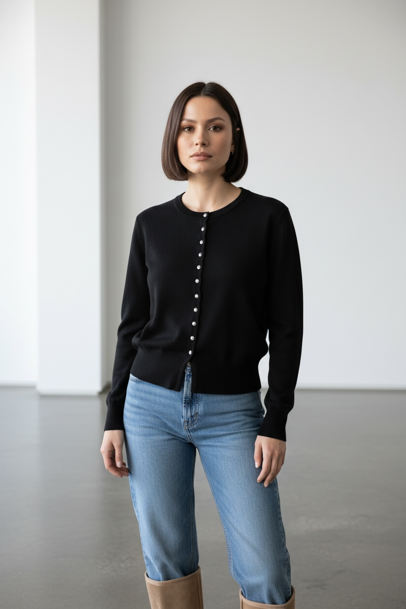 Kadın Beyaz Düğmeli Pamuklu Hırka, yuvarlak yakası ve uzun kollu tasarımıyla günlük kullanım için sade ve şık bir görünüm sunar. Pamuklu dokusu sayesinde gün boyu konfor sağlarken, nefes alabilen yapısı ile mevsim geçişlerinde ideal bir tercih olur.