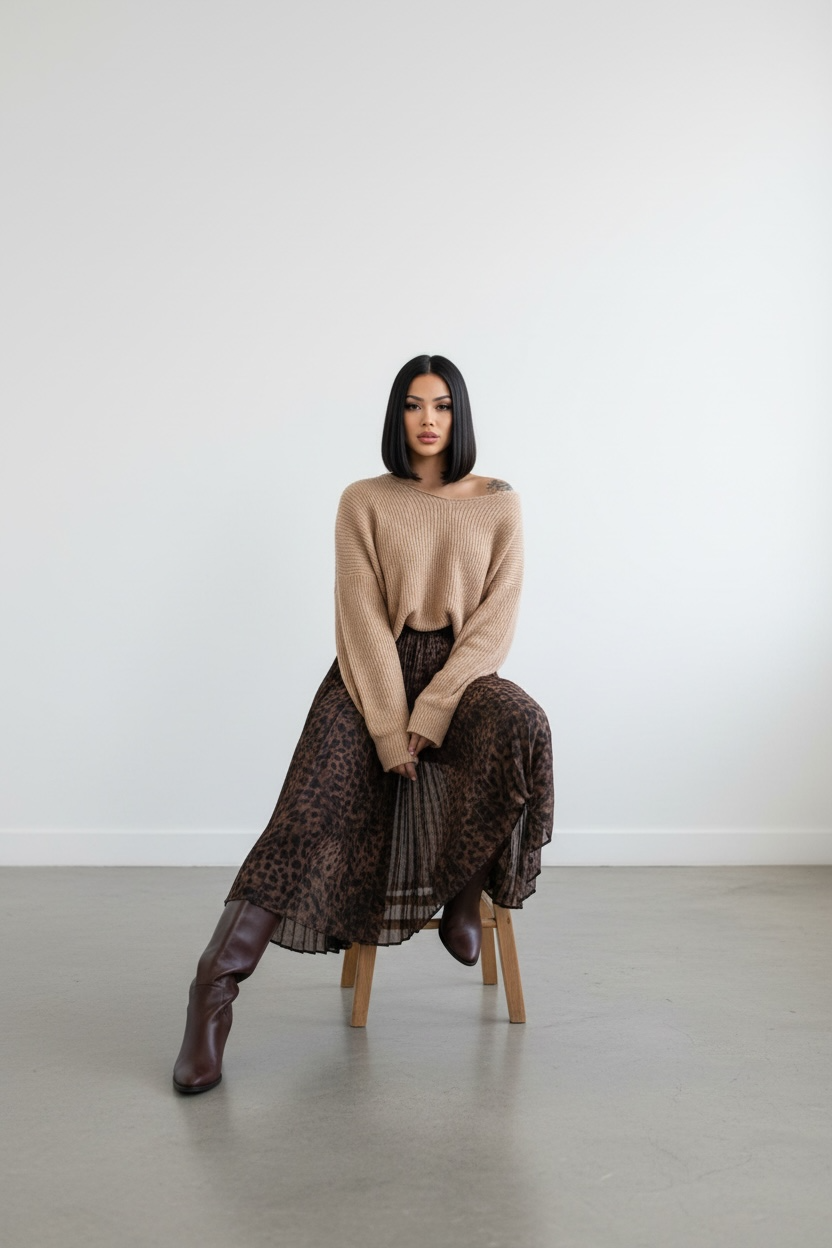 Akışkan plise yapısı ve desenli dokusuyla öne çıkan Mocha Dream Asimetrik Plise Etek, modern ve iddialı bir stil sunar. Hareketli formu sayesinde her adımda şıklığı hissettirirken, rahat kalıbıyla gün boyu konfor sağlar.