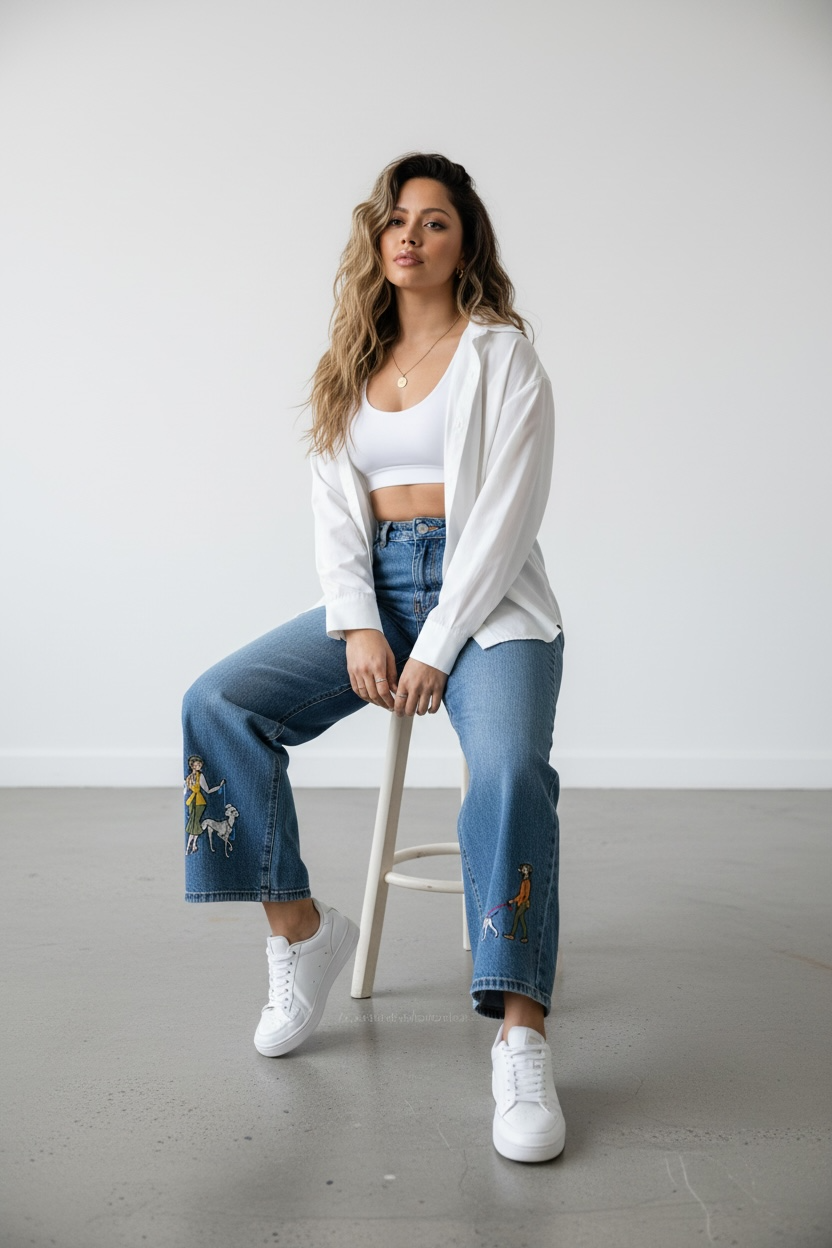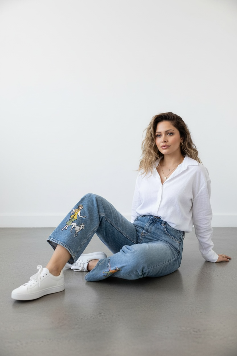 Klasik denim şıklığını eğlenceli illüstrasyon detaylarıyla yeniden yorumlayan Sanat Dokunuşlu Jean Pantolon, paçalarındaki yürüyüş yapan figür baskılarıyla sıradan jeanlerden net şekilde ayrılır. Özgün detayları sayesinde sokak stiline sanatsal ve karakterli bir hava katar.