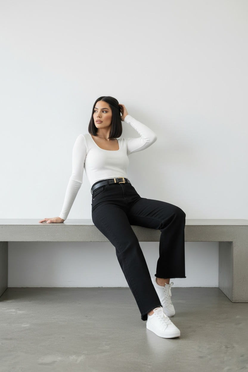 Siyahın en güçlü haliyle tasarlanan Black Edge Wide Leg Jean, gardırobun vazgeçilmez parçalarından biri olmaya aday. Yüksek bel formu beli daha ince gösterirken, geniş paça kesimi feminen ve cool bir duruş yaratır. Hafif yırtık paça detayı ve altın tokalı deri kemerle tamamlanan tasarımı güçlü bir stil vurgusu sunar. Kemer ürüne dahildir.